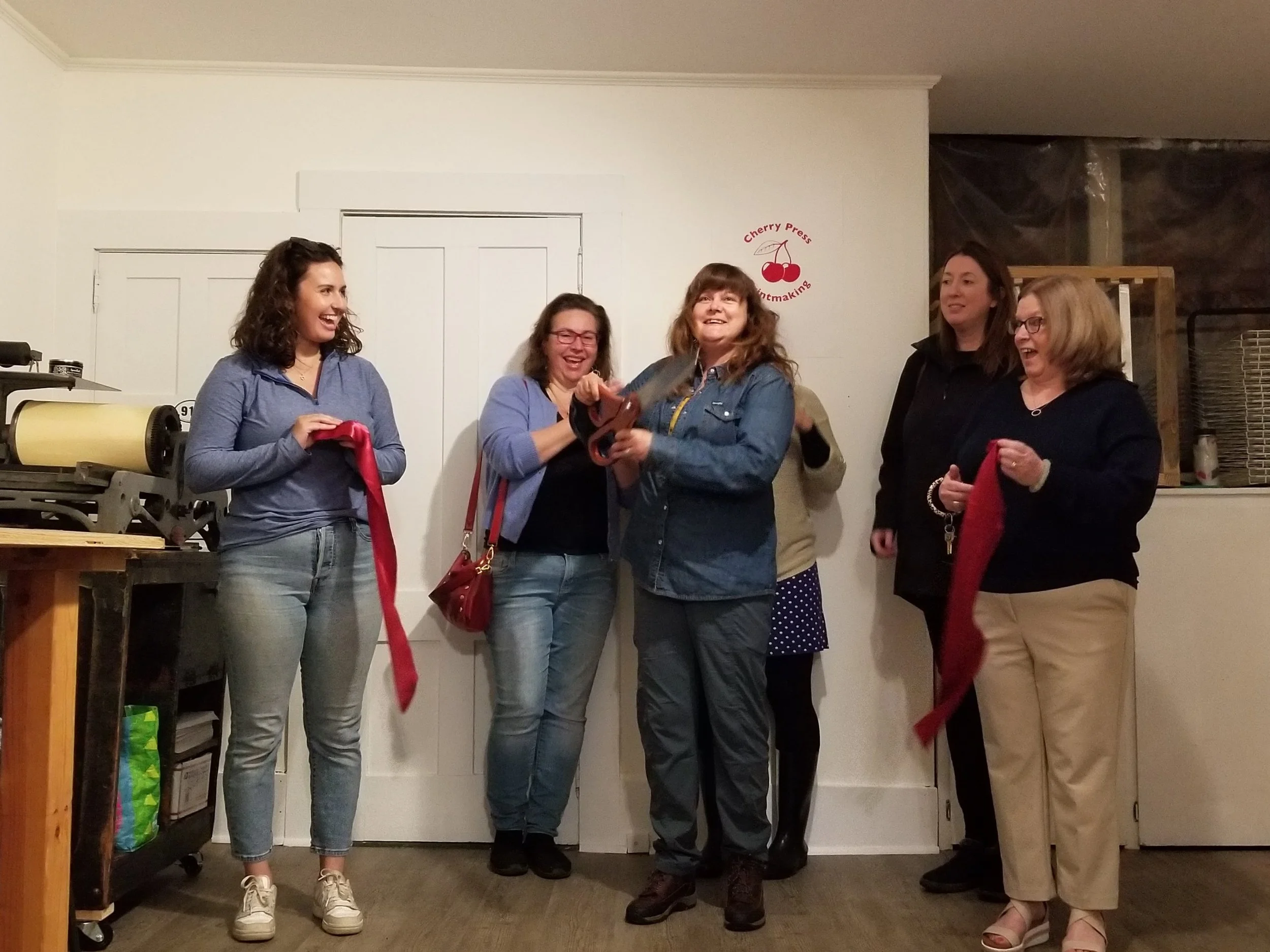 Pictured above winner Corinne Rhodes — Cherry Press Printmaking grand opening ribbon cutting.